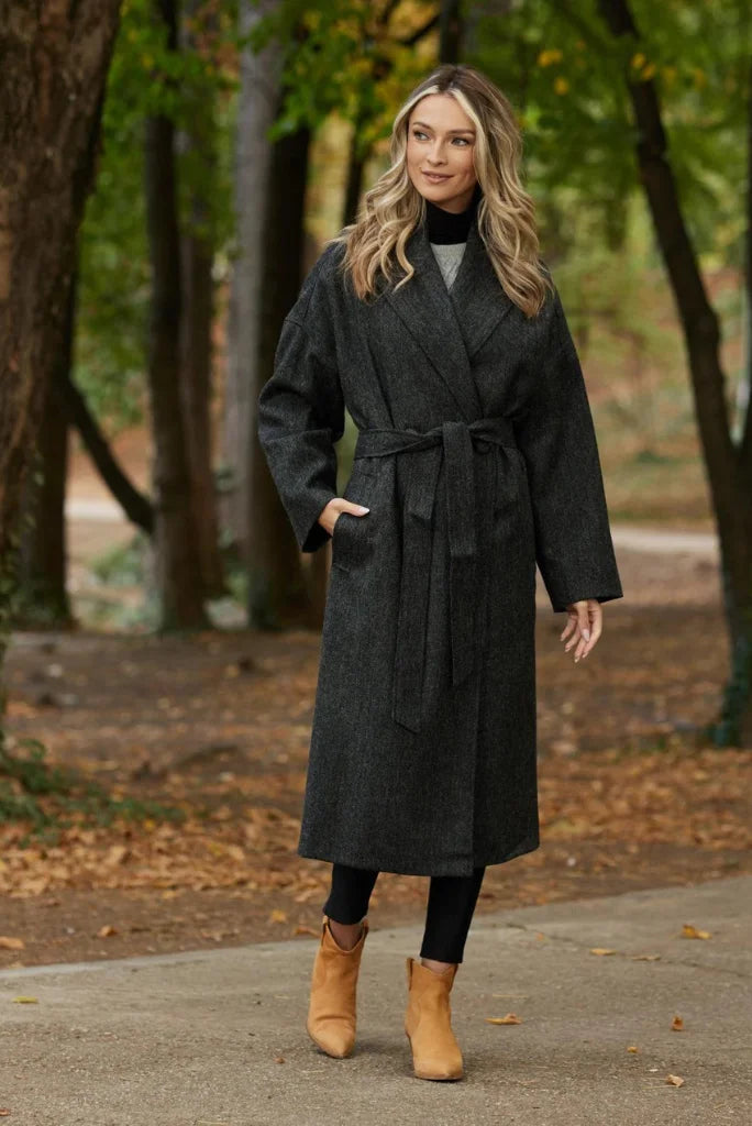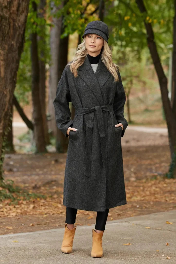 Women Grey Winter Long Coat, Classic Double Breasted Belted Coat for Her